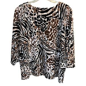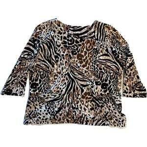 Details: Show your wild side by embracing this fashionable animal print, knit top from Alfred Dunner. Crafted with quarter length sleeves and a round neckline with a cut out design and diamond studs for a little sparkle giving this top a stylish look. Ensure its attention-grabbing design using its black, brown and white animal print pattern, while its slimming Petite-L size fits all body shapes. An exclusive piece that takes pride in being timeless. Get the most of the moment and enjoy the spotlight with this fabulous top.