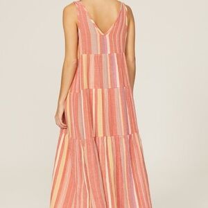 1. Marine Layer Corinne Striped Linen Maxi Dress Pink Orange Tiered Boho Pockets