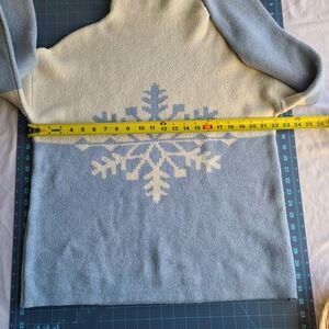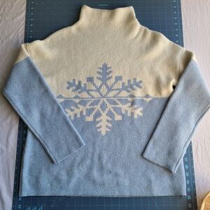Embrace the winter season in this darling Christian Siriano funnel neck pullover, a true aesthetic dream. Crafted from a super soft blend, this sweater promises cozy comfort with an oversized fit. The beautiful baby blue and ivory colorblocking is adorned with a prominent snowflake design, perfectly capturing a chic, seasonal charm. This piece is an effortless way to add a touch of whimsical elegance to your cold-weather wardrobe. Note a small untreated mark on the sleeve shown in pic.