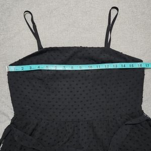 This dress features a timeless black color accented by a delicate Swiss dot texture and romantic lace insets at the hem. The sleeveless silhouette is complemented by adjustable spaghetti straps.