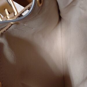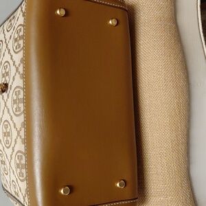 Chic Tory Burch tote with signature logo pattern. Stylish brown and cream design. Perfect for daily use.