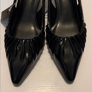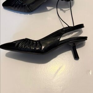 New chic black kitten heels with a pointed toe. Stylish slingback design. Memory foam padding. Perfect for any event.