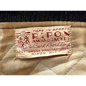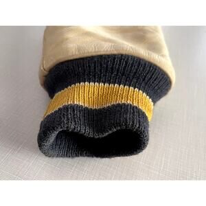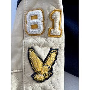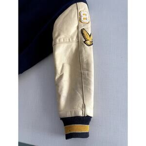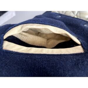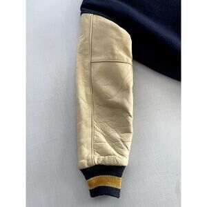 Ripon Award Letterman Jacket in Navy Wool and Light Yellow Leather in Men's Size Medium. I'm estimating the size. Please see the measurements to see if this jacket with work for you.