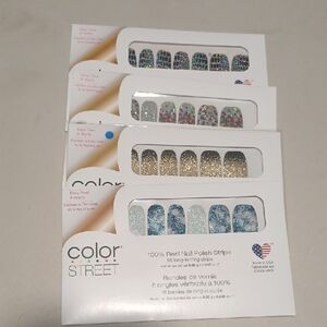 Collection of Color Street nail strips. Features glittery silver, gold, and blue designs. All BNWT. 1 package slight tear but nails not effected.