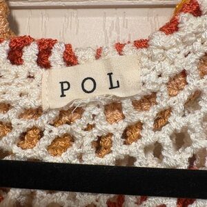 Stylish knit poncho by POL. Features a mix of vibrant colors. Perfect for layering. Cozy knit crochet fringe sweater with a hood. Features cream and orange stripes. Perfect for layering. Great Boho cover up, festival wear or just adding a touch of fun to your ensemble. 22” PTP NWOT.