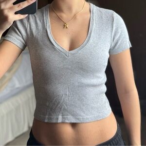 Stylish light gray crop top with a flattering V-neck. Soft ribbed fabric for a comfortable fit.