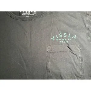 Vissla graphic tee in black with a vintage wash finish. Features a chest pocket on the left side and a Vissla logo graphic on the back with 'Raised by Waves' text. The neckline has a Vissla branded tag indicating 'Vintage Wash' and size Medium.