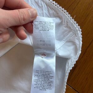 Very sweet white cotton wrap-style Ganni blouse with exaggerated ruched sleeves. The blouse has gorgeous eyelet trim around the neckline and bottom hem.