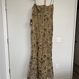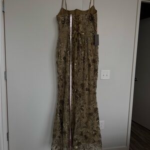 Stunning metallic gold maxi dress. Features a lace-up back design. Ideal for glamorous events.