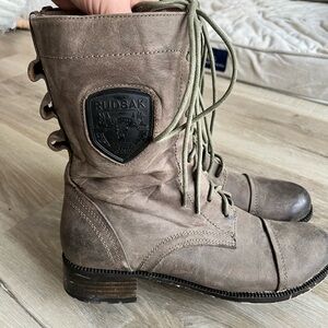 RUDSAK lace-up boots in taupe. Features a bold logo patch. Durable and stylish.