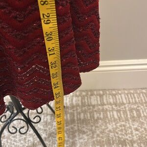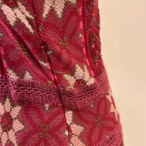 The dress in the image is a Cecilia Prado Luiza sweater dress in burgundy with an intarsia knit design, found at Anthropologie. This specific style features long sleeves, a scoop neck, a fit and flare silhouette, and a geometric/snowflake pattern around the chest and waist. The dress is lined.