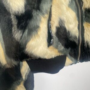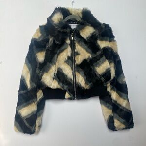 Stylish Zara jacket with black and cream faux fur. Features a zip closure and hood.