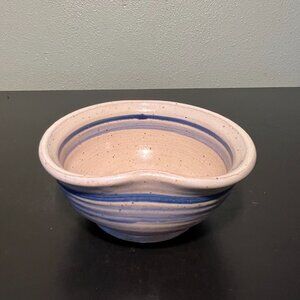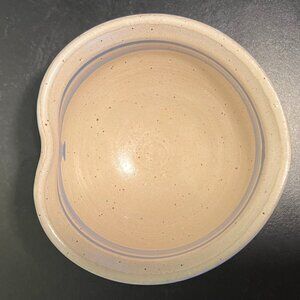 Dakota Stoneware handcrafted, handthrown pottery bowl with a subtle heart shape features a tan matte finish with brown speckles on interior and exterior. The exterior has an attractive subtly ribbed surface, Both inside and outside is decorated with a light blue and a dark blue stripe. Measures 2.5” tall and 4.5” across at widest point. Unglazed underside has an incised maker’s mark that reads, DAKOTA STONEWARE 1989.