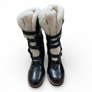 Elegant black leather moto boots with cozy cream shearling lining. Stylish buckle straps for a modern look. 2.2" wooden stacked heel with 0.6" front - Mid-calf length - Round toe - Black pebbled leather - White shearling tongue with leather backing - Adjustable front smooth leather straps with matte silver-tone buckle fastening - leather shank 100% Leather Upper / 100 Leather Sole - Worn Once, light wear (as seen in photos) Style tags: leather, moto, motorcycle, grunge, winter, fall