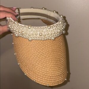 Elevate your style with this chic tan visor, adorned with elegant pearl embellishments. Perfect for adding a touch of sophistication to any outfit.