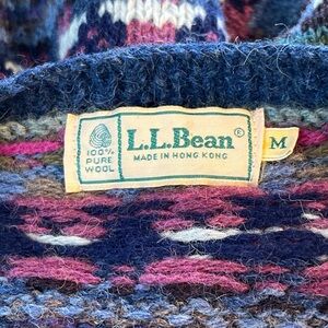 This vintage LL Bean cardigan is a women's medium size made of wool with a tight-knit design featuring an animal print pattern of sheep, geese, and horse. The cardigan has long sleeves, a crew neck, and button accents, making it a perfect casual piece for the winter, fall, or spring seasons. The blue color and retro 80s, prairie, and hippie themes add a unique touch to this classic cardigan from the brand L.L. Bean. Made in Hong Kong, this cardigan is a stylish addition to any wardrobe for those who appreciate vintage fashion.