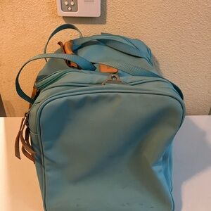 Elegant duffel bag by Jon Hart Design. Aqua body with tan leather accents. Perfect for travel. Has some dark little stains on it, please check pictures