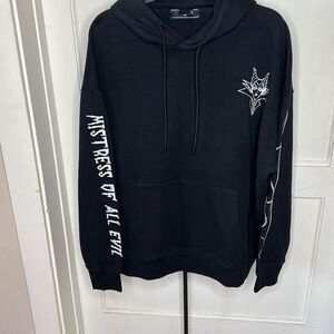 A knit hoodie featuring embroidered front and back Maleficent designs, "Mistress Of All Evil" text, and flame details, long sleeves, ribbed trim, and a drawstring hood.