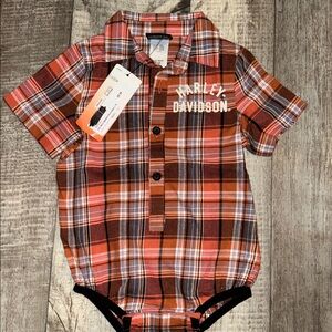New with Tags Stylish short sleeve plaid shirt with Harley-Davidson logo on back and front— 4 front buttons- 3 snap crotch— 109% cotton- . Ideal for casual wear. Size 9-12 months