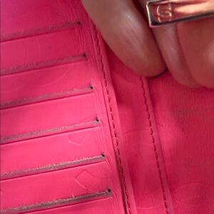 Good condition good corners outside in great used condition inside has some stains in coin compartment and stains on inside pink leather