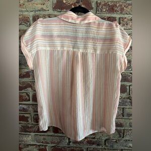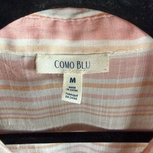 Lightweight Como Blu button-up top with soft pink, white, and peach stripe pattern. Perfect for spring/summer, work, brunch, or a casual everyday look. Easy to wear tucked in or left loose!