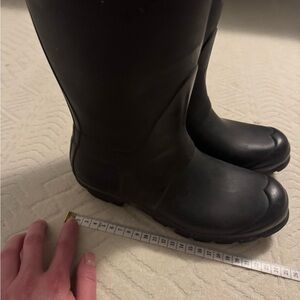 Durable black boots and cozy socks by Hunter. Ideal for rainy days.