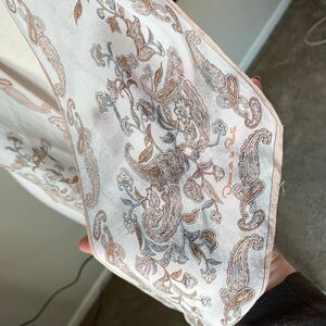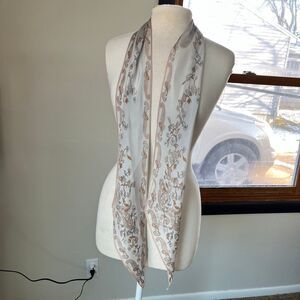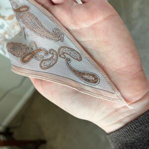 The color palette—taupe, blush, warm beige, and soft gray—is soft and cohesive, giving the scarf a quiet, cameo-like elegance that feels timeless and understated. It works beautifully with modern minimal wardrobes as well as true vintage pieces.