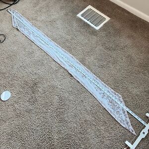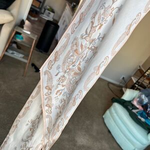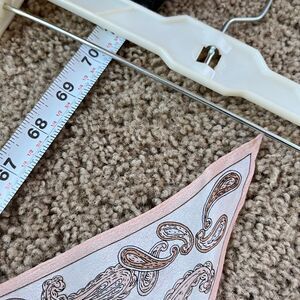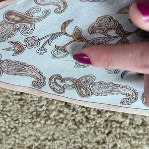 The silk is sheer with a gentle sheen and a light, fluid hand. Because of the bias-cut parallelogram construction, the width naturally shifts depending on how it’s laid flat or worn and is not fixed by design.