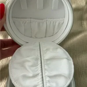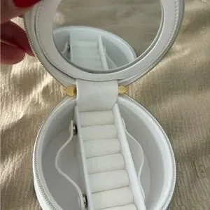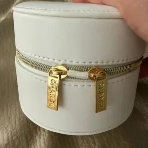Chic Chanel jewelry box in white. Features gold zipper accents. Ideal for storing treasures.