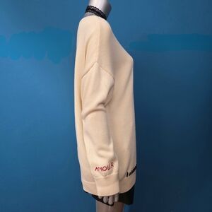 NEW! Be still my heart! This playful cotton sweater will be a sweet statement piece for your beautiful Valentine’s Day. Soft, comfy, and creative, with a large red heart woven into the front accented with black whipstitching, makes this piece simply adorable. An oversized sweater that can be thrown on with cute leggings or jeans, or ups your game with an edgy leather skirt. With “AMOUR” embroidered on one sleeve in red and black whipstitch accents on the other, what’s not to love? From a super fun Gallentine’s Day party to a romantic Valentine’s night on the town, it will be a total “Oh la la!” // *(SOLD OUT on Anthropologie!) // (48% Cotton / 52% Acrylic)