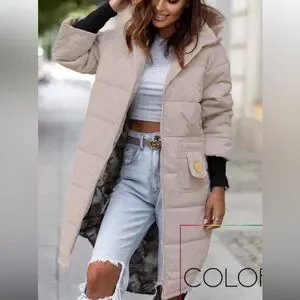 Chic beige/taupe puffer coat with a cozy hood. Perfect for staying warm and stylish.