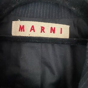 Marni, made in Italy, synonymous with quality and design creativity. This wool and cotton women’s blazer is black with a very faint pinstripe. It’s single breasted, fully lined, has three front pockets that have not been opened, and a rear slit. It’s in perfect condition. Size 40 which is a US size 4.