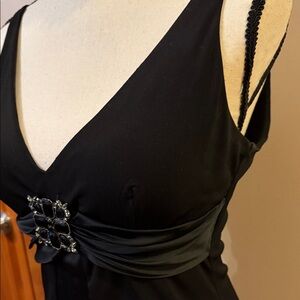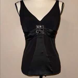 Chic black blouse with a deep V-neckline. Features an elegant embellished front. Ideal for evening wear. It has lot of stretch. I Loved this top! Still in great condition.