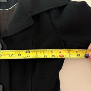 Chic black pea coat with button closure. Features stylish collar and sleek design. Ideal for cool weather.