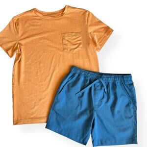 Rumi+ryder size medium 8/10 orange short-sleeve tee. Quick-dry and moisture wicking. Super soft! Solid blue, pull-on style shorts by heard & Scene. Elastic waistband with functional drawstring. The end of one of the drawstrings was melted in the dryer. Love the large backside pockets. Super soft! Both pieces in great shape besides the melted drawstring. Great as a set or easily mix and matches with other items. Perfect for this Spring and Summer!