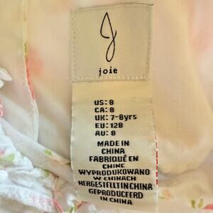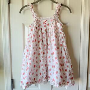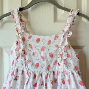 Size 8, Joie Girls strawberry and raspberry print sleeveless Summer sundress. Ruffle on straps and around bottom hem. Three pink buttons on back. Fully lined. I dont see any stains or flaws. Light wear. Very good used condition.