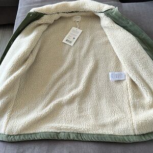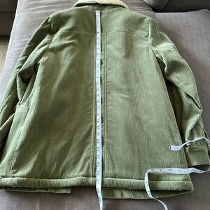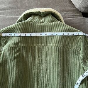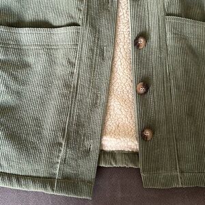Stylish green corduroy jacket. Features a cozy cream collar. Perfect for layering.