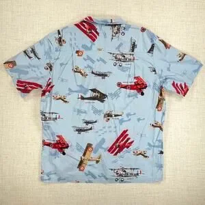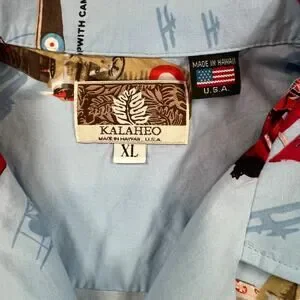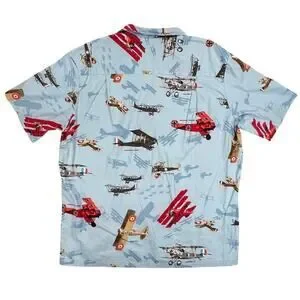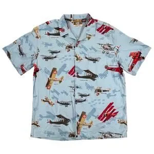 Kalaheo Mens WWII Fighter Plane Hawaiian Camp Shirt Blue Size XL / Extra Large. Light blue with fighter plane / biplane / triplane print. Made in Hawaii, USA. Excellent pre-owned condition.