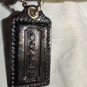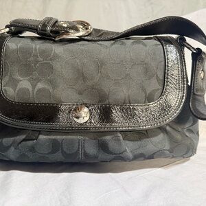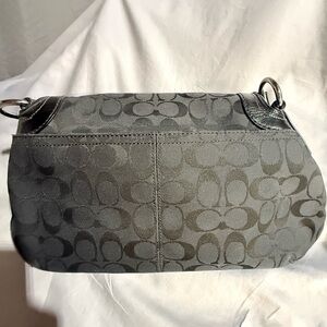 Stylish black shoulder bag with signature pattern. Features a sleek design and silver accents. Ideal for any occasion.