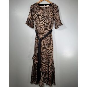 Anthropologie Foxiedox Assymetric Billie Zebra Print Ruffle Dress Tan Black Size Small