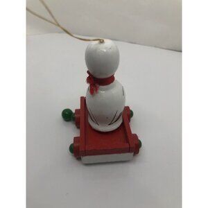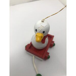 This vintage wooden ornament is a charming addition to any Christmas collection. The hand-painted toy pull wagon features a cute goose or duck sitting inside, adding a touch of whimsy to your holiday decor.