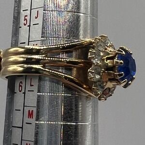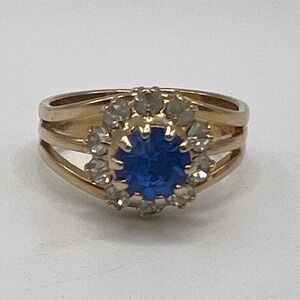 Gold Tone Blue Crystal Halo Ring Adjustable Size 6.5 -7 September birthstone