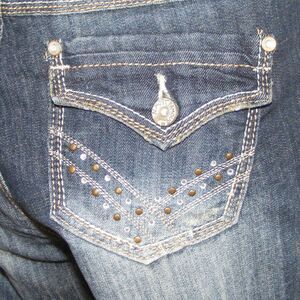 Pocket, back pockets have flaps with buttons.