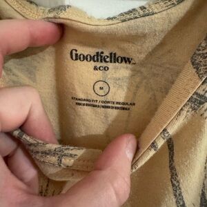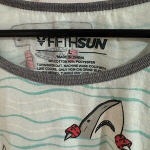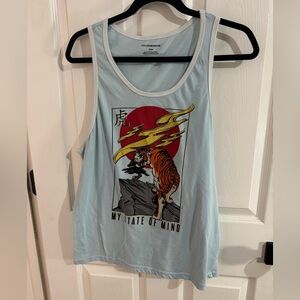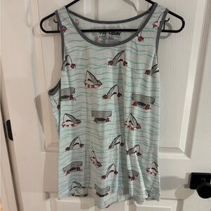 includes 5 pre-owned/gently used tank tops. all are a size M except the shark tank top which is marked as a large, but fits more like a M.