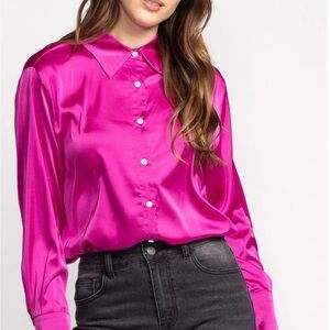 Elevate your style with this vibrant pink satin blouse. Perfect for any occasion, this top offers a luxurious feel and a flattering fit. Fits like a medium.