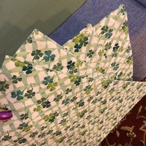 Longaberger 4 Fabric Shamrock Placemats in what I consider Good USED Condition but since they have been used they show some all over wear and may have minor Imperfections and or Flaws. I feel my Pictures make these look a bit more vibrant than they are in person but pictures appear differently on different screens. I believe they called the pattern Lots of Luck or something similar to that. They are wrinkled from use and storage. Measurements are rough approximate measurements and colors may be off because of lighting. Bundle with other items from my closet and only pay 1 shipping fee up to 5 lbs packaged.