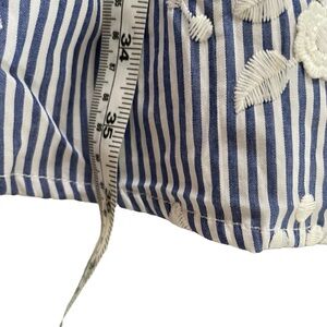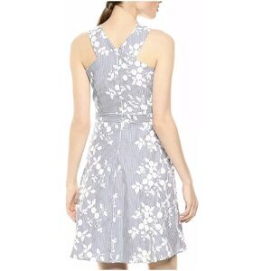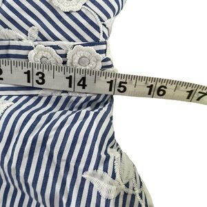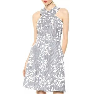 Turn heads in this breezy vacation-ready cotton stripe fit and flare dress with delicate flower Embroidery and flattering criss cross halter neck. Free and airy. Dry clean only.