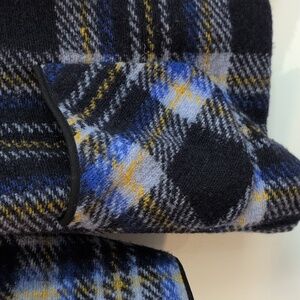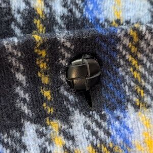 Plaid pattern in blue, navy and yellow. Single button closure. Two front pockets. Not lined.