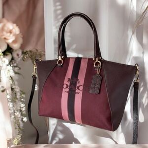 This version of the Coach Prairie Satchel features the iconic Coach Horse and Carriage motif set against sporty Varsity Stripes on a lightweight jacquard fabric, combined with polished pebble leather. This medium-sized satchel is designed for everyday use and can be carried by its top handles or worn as a crossbody bag using the detachable strap.