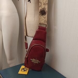 Upgrade your style with this vegan leather maroon sling bag. Perfect for keeping essentials close and hands-free. 9" x 5" x 3". Only used once at Universal Studio. Hufflepuff ID clip is included with purchase. The clip is also new.